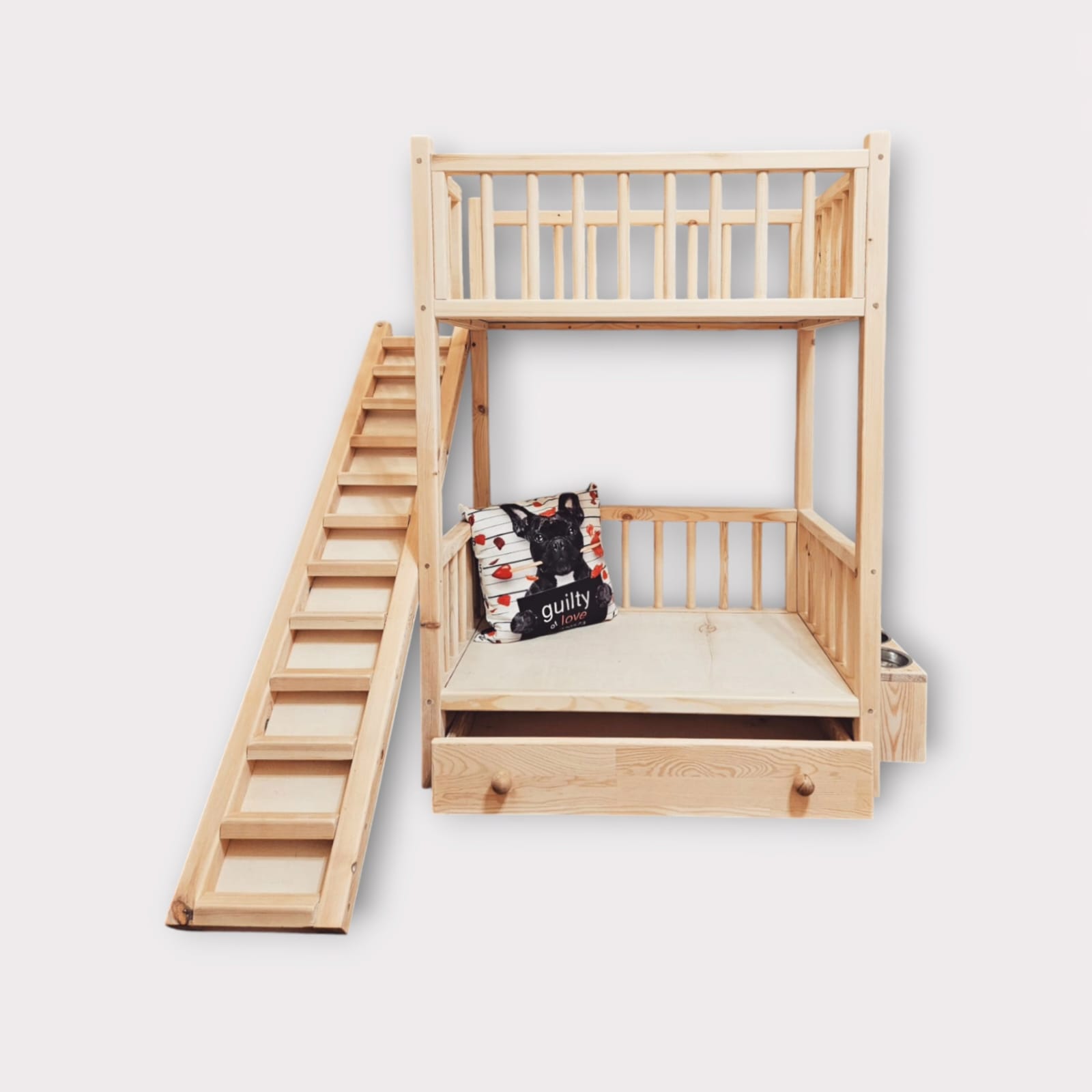 Woodenpetbed ile minik dostlarımıza sıcacık bir yuva ve eğlence dolu bir dünya hediye edin. 3 farklı ebat ile küçükten büyüğe her evcil hayvanın en sevdiği köşesi olacak. Özel üretimi ile küçük patilerin en özel köşesi olmaya şimdiden aday. Onlar her hareketiyle bizlere ne kadar sevimli olduklarını gösteriyor. Woodenpetbed ile sizde onlara sevginizi gösterin. Birden fazla evcil hayvanı olanlar için daha avantajlı fiyata sahiptir. Özellikle birden fazla kedisi olanlar için harika bir ürün estetik ve şık görünümü ile direk ilgi odağıdır. Üst katın dört tarafının kapalı olması ve sadece kapı girişinin açık olması ona uyuyacağı zaman güvende hissettirir ve kapalı alanı seven evcil hayvanlar için güzel bir alandır. Yüksekliği 125 cm olduğu için üstünü aksesuarlar ile süsleyebilir ve onlara oyun alanı oluşturabilirsiniz. Premium ranza portatif merdivene sahiptir. İster yatay ister dikey bir şekilde kullanabilirsiniz. Ve sadece 2 vida ile bu yönü değiştirebilirsiniz. Altındaki çekmece ile tüm eşyalarını kaybolmadan muhafaza edebilirsiniz.